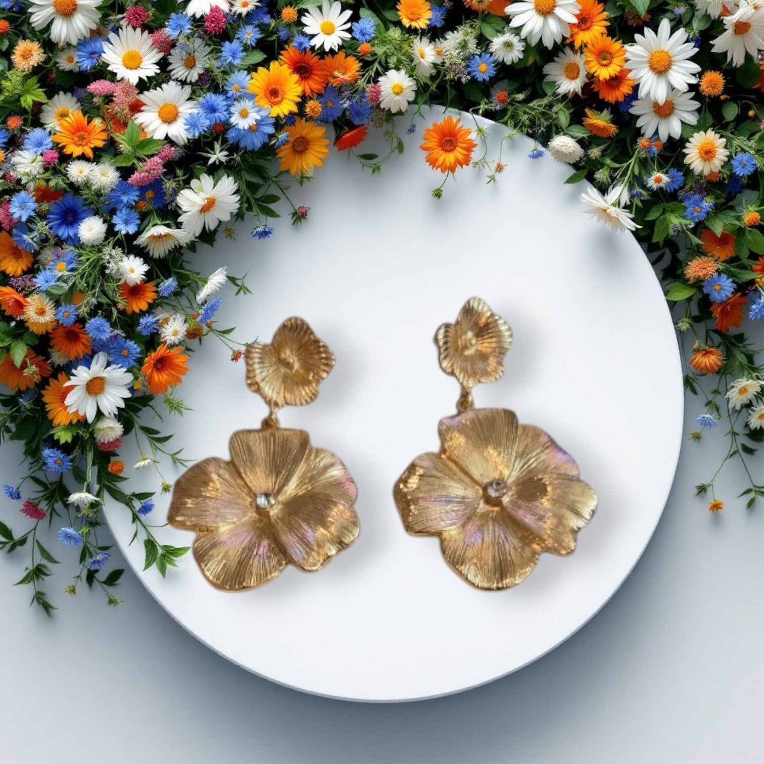 Apportez une touche d’élégance naturelle à votre look avec ces boucles d’oreilles pendantes en forme de fleurs dorées. Leur design délicat et lumineux capte la lumière pour sublimer votre visage et attirer les regards.