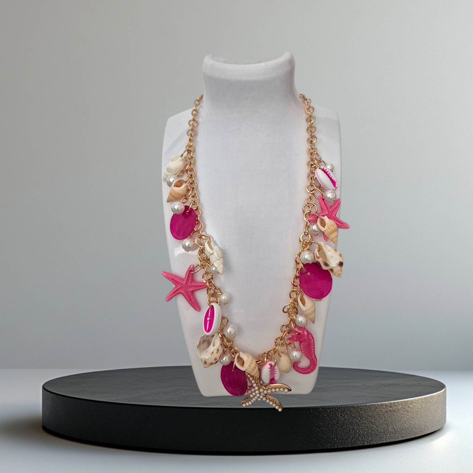 Collier chaîne dorée, gros breloques rose, blancs, dorés.
