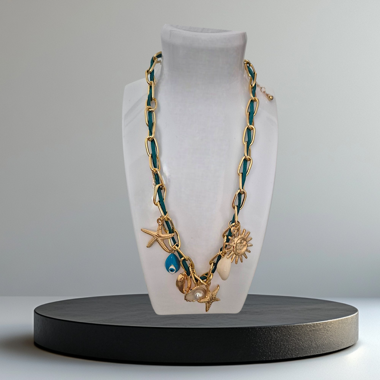Collier chaîne dorée, breloques étoile de mer, coquillage, soleil
